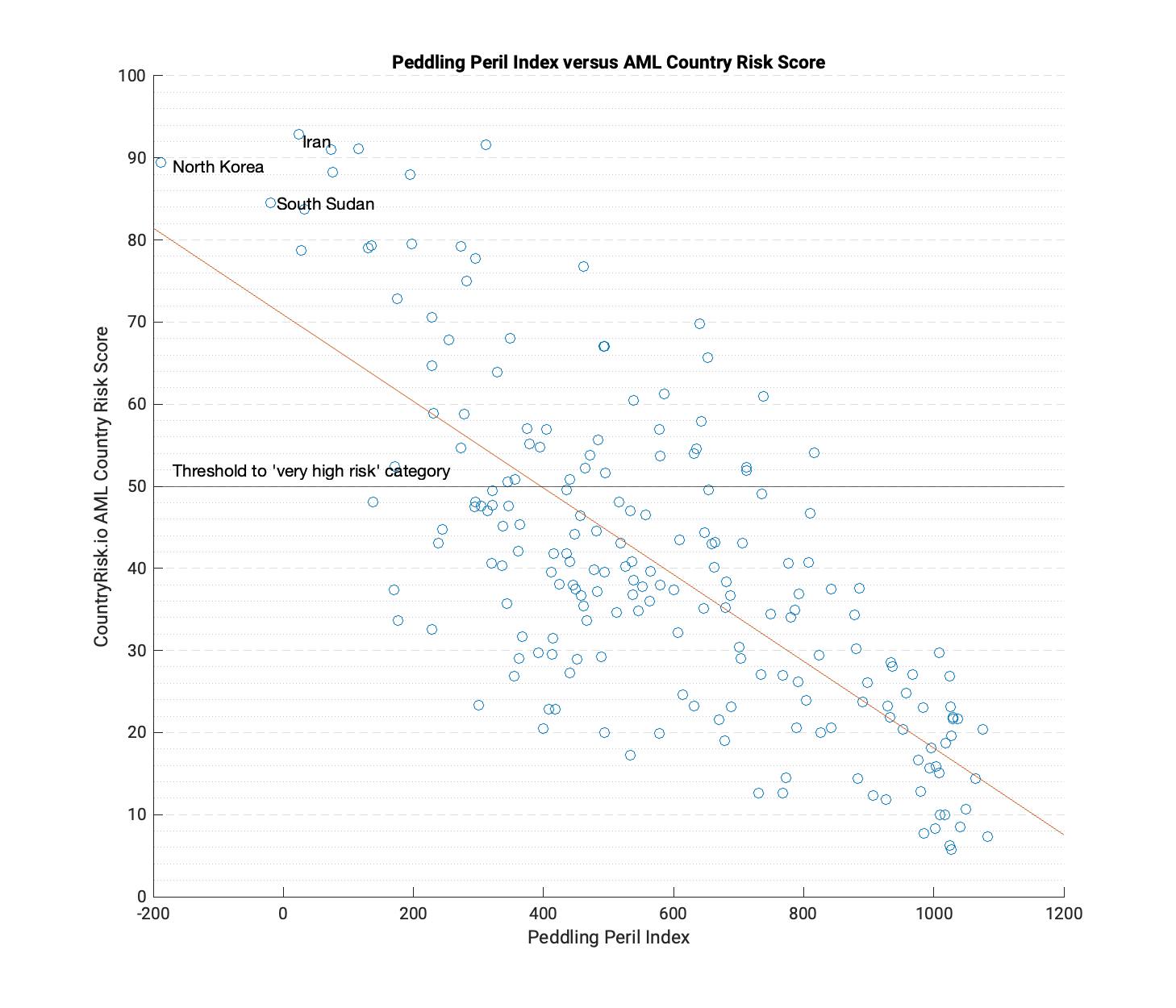 From this perspective, our coverage is robust. However, the CSSF also highlights the Peddling Peril Index (PPI) as a best-practice risk measure. The PPI, produced by the Institute for Science and International Security (Link), assesses the strength of national strategic trade controls aimed at preventing the spread of nuclear and other destructive weapons—and the means to produce them. Its mission is well summarised in the latest PPI report: