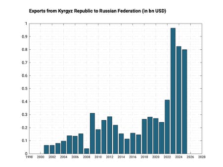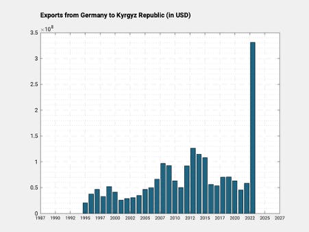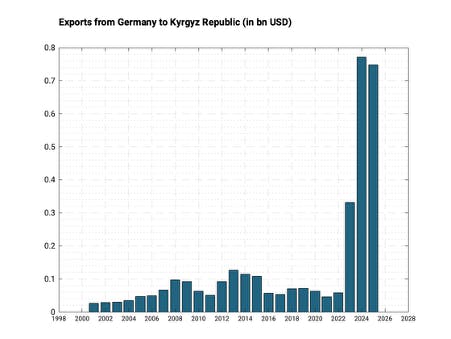 While the relative growth of exports from Germany to Kyrgyzstan and onward to Russia appears dramatic, the absolute value of USD 800 million remains small in the context of Russia’s overall trade volume of roughly USD 400 billion — essentially a rounding error.