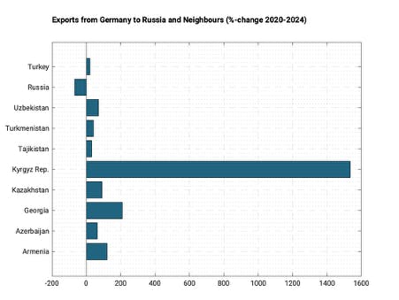 The Kyrgyz Republic was not alone in this trend. The entire region experienced a notable rise in trade flows from Germany. The chart below compares the relative changes in German exports to Russia and neighbouring countries. While exports to Russia dropped by nearly 70% between 2020 and 2024, trade with several surrounding countries increased sharply.