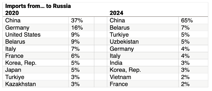 China’s role has become overwhelming: it now accounts for around 65% of Russia’s trade among its top ten partners. In 2020, several European countries were among Russia’s main export destinations — largely due to oil and gas imports — but they have since fallen out of the top ten altogether. From that perspective, sanctions have clearly had a substantial impact.